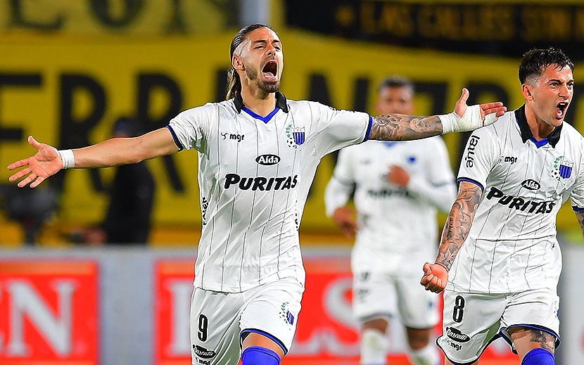 Thiago Vecino, con el grito de gol a pleno y los brazos abiertos en el festejo, que comparte con Gonzalo Nápoli.