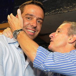 Ignacio Ruglio (Sentimiento 1891), gran triunfador de la noche con dos cargos en el Consejo Directivo y Juan Pedro Damiani, reelecto en la presidencia de Peñarol en el abrazo.