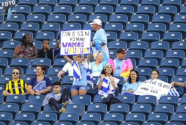 “Con o sin himno vamos Uruguay”, otro de los carteles que portan los cientos de hinchas uruguayos que comienza a poblar las tribunas del Estadio Lincoln Financial Field de Philadelphia. Se estima que serán 10.000 los compatriotas que dirán presente.