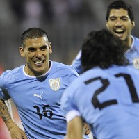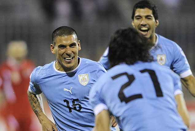 Maximiliano Pereira corre en el festejo del primer gol uruguayo seguido por Luis Suárez y Edinson Cavani.
