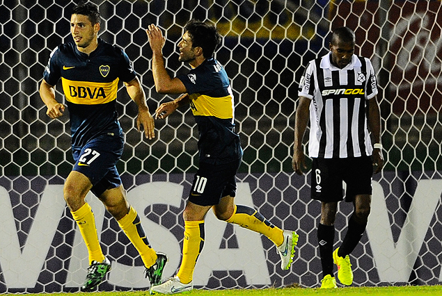 Jonathan Calleri, su autor, corre perseguido por Nicolás Lodeiro en el festejo del segundo gol de Boca Juniors, que sufre cabizbajo Paulo Lima.