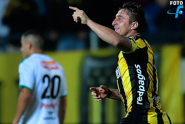 Cristian Rodríguez y su cara plena de felicidad para dedicar el tercer gol aurinegro.