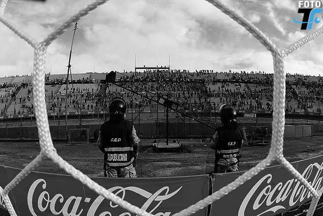 Miles de hinchas con entrada en mano se quedaron en la puerta… Un minúsculo grupo –vale decirlo, no todos- apostados fuera con el apoyo de otros pocos desde adentro, se enfrentaron con efectivos policiales. Fue una batalla campal, con los hinchas lanzado piedras, botellas e incluso desde la parte alta de la tribuna, dos (¡2!) garrafas de gas de 13 kilos en contra de los efectivos de las fuerzas de seguridad. Un efectivo y un perro de la guardia resultaron heridos.