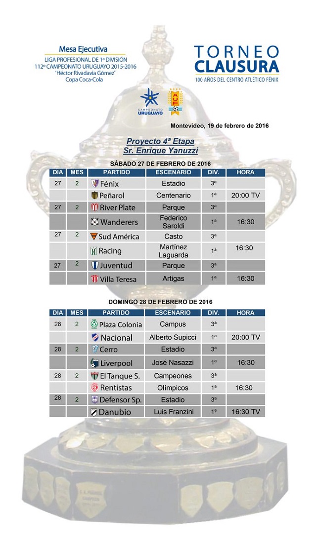 Fénix fijará el Estadio Centenario para jugar el sábado 27 de febrero frente a Peñarol, por la cuarta fecha del Torneo Clausura. El partido se jugará a la hora 20 y será televisado por VTV. A primera hora del sábado, o sea desde las 16.30, habrá otro televisado que saldrá de River Plate – Wanderers, Juventud – Villa Teresa o Sud América – Racing. Tenfield anunciará cual de ellos será el elegido una vez que finalice la tercera fecha.