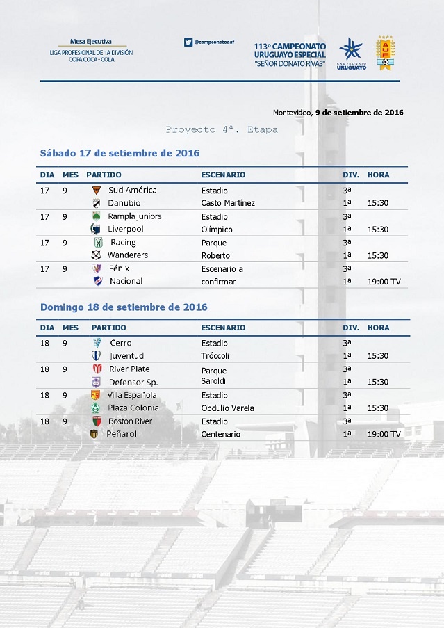 Si Fénix fija un escenario con red lumínica para enfrentar a Nacional el próximo sábado, entonces el encuentro se jugará a la hora 19.00 y en ese caso, el partido televisado de primera hora será Rampla Juniors – Liverpool que jugarán en el Estadio José Nasazzi a partir de la hora 15.30.