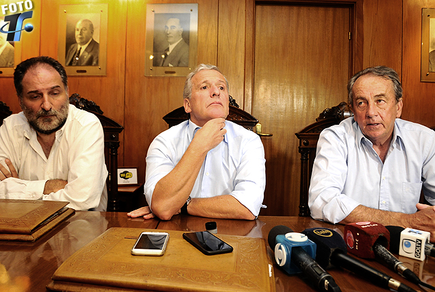 Walter Pereyra, Juan Pedro Damiani y Juan Ahuntchian en la conferencia del domingo en el Palacio Peñarol.