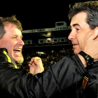 Sergio Cabrera y "Polilla" Da Silva en el abrazo emocionado del cuerpo técnico campeón.