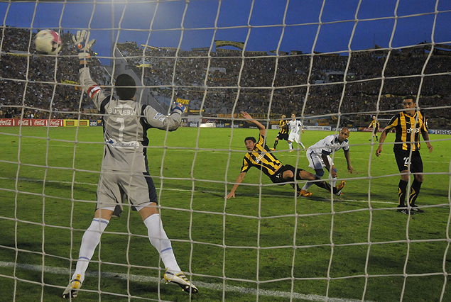 Juan Manuel Olivera ya cabeceó y desde el piso, observa como la pelota vence la resistencia de Adrián Berbia y viaja rumbo a la red. Segundo gol de Peñarol.