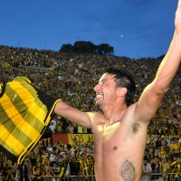 Juan Manuel Olivera en el grito eufórico de gol revoleando la camiseta de Peñarol.