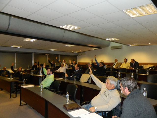 UNANIMIDAD. Los doce clubes presentes más la representación de la Segunda Profesional, otorgan la venia a Liñares para presidente de la Comisión de Árbitros. En el ángulo superior derecho de la foto aparecen Giuria, Grachot y Costa, de la Mesa Ejecutiva. Comparecen en calidad de oyentes pero no tienen voto, por eso no se los ve con la mano alzada.