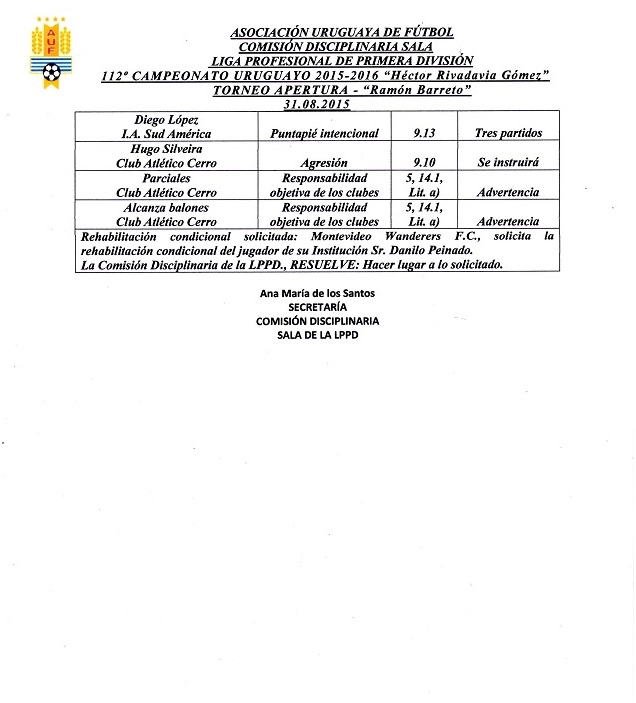 La Comisión Disciplinaria, Sala de Primera División, sesionó en la víspera dictando las resoluciones correspondientes a la tercera fecha disputada el pasado fin de semana, al igual que el de Diego López de Sud América, correspondiente a la segunda etapa que había sido instruido.