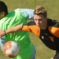 Ignacio González en la lucha por el balón en el amistoso con Sud América.
