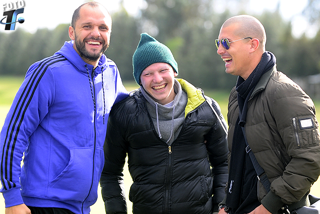 Jadson Viera, Marcelo Tabárez y Pablo Lima en la visita del delantero con la alegría en el momento compartido.