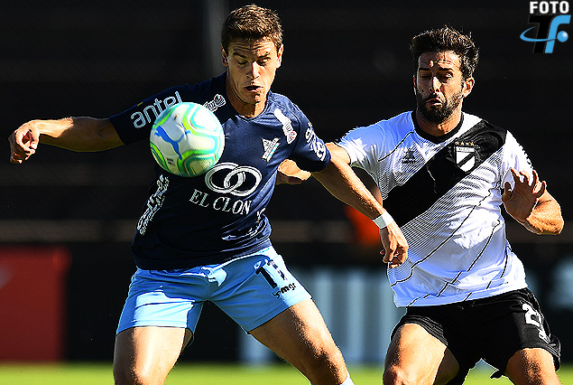 Diego Casas, delantero de Cerro, cubre la pelota frente a la marca de Ernesto Goñi, zaguero de Danubio.
