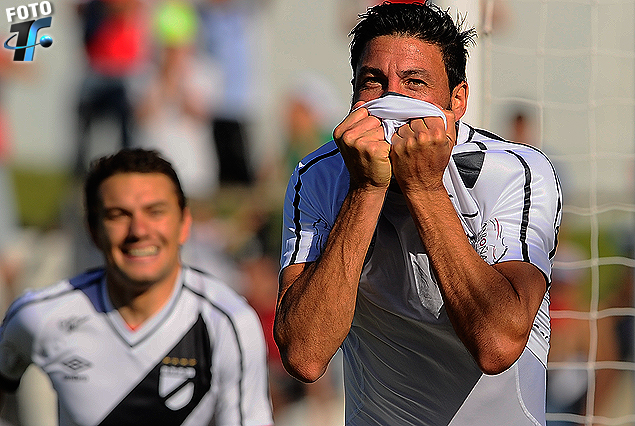 Segundo gol de Danubio. La pelota acaricia la red, Juan Manuel Olivera, su autor comienza el festejo.