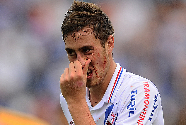 José Aja se toma la nariz intentando detener el profuso sangrado. que le manchó de rojo su camiseta blanca.