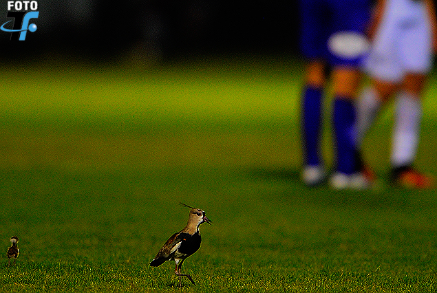 El tero y su cría en primer plano, los jugadores aparecen difusos en el fondo. Clásico empate en el Franzini.