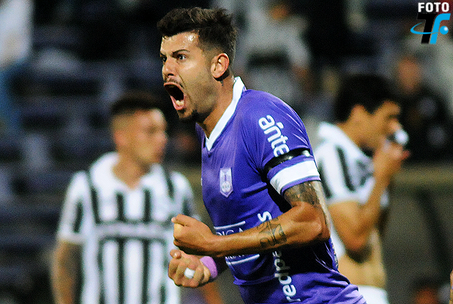 Santiago Correa en el festejo de gol para los violetas.