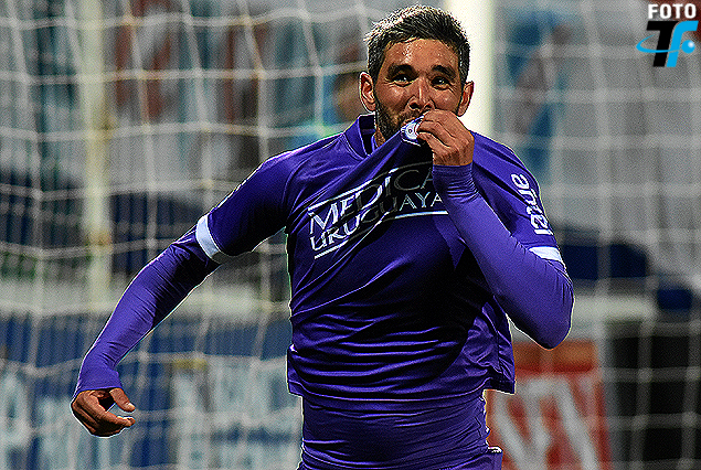 Alvaro Navarro y el sagrado beso a la camiseta en el festejo del segundo gol violeta.