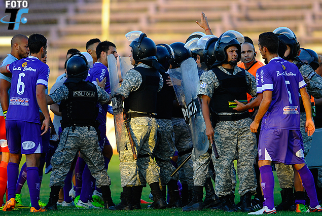 Los jugadores violetas protestan de cara al árbitro Oscar Rojas que es protegido por la policía.