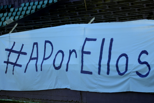 “A por ellos”, la bandera que apareció este domingo, colgada del alambrado de la platea principal del estadio Franzini.