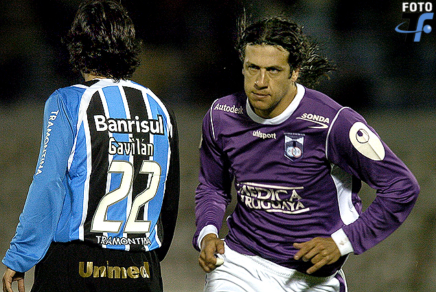Gonzalo Sorondo en el primer gol de Defensor Sporting en el último triunfo ante Gremio en 2007.