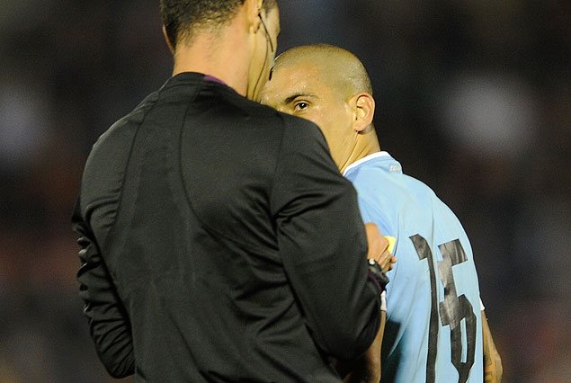 El árbitro colombiano anota la tarjeta amarilla que le acaba de mostrar a Maxi Pereira,