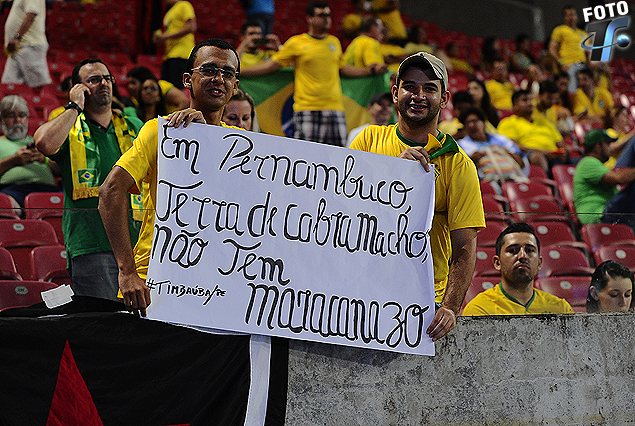 MARACANAZO: “Em Pernambuco nao tem maracanazo”, el enorme cartel que portaron dos hinchas brasileños. El “fantasma” de 1950 más vivo que nunca, sobrevuela el espectacular estadio mundialista. Las distintas tribunas comienzan a teñirse de amarillo.