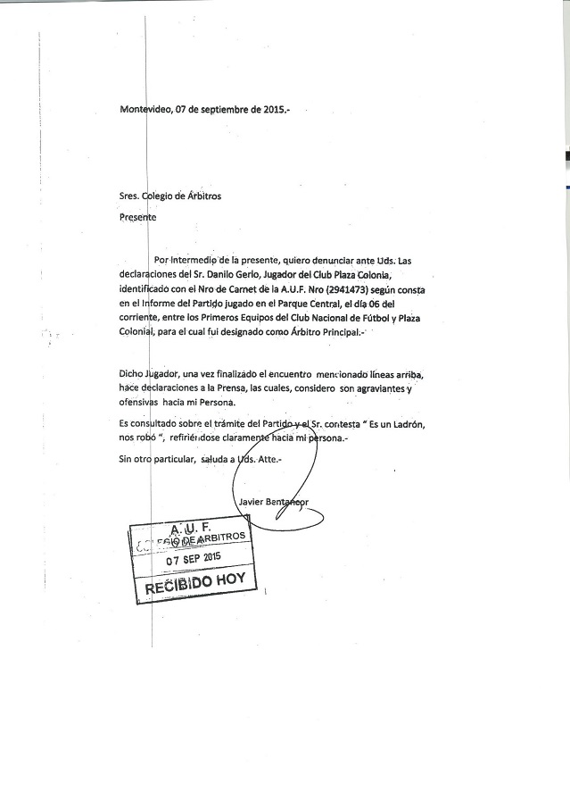 El árbitro de primera categoría, Javier Bentancor, denunció ante la Comisión Disciplinaria de la AUF al futbolista argentino de Plaza Colonia, Danilo Gerlo, por considerar que las disculpas públicas por este realizadas no fueron suficientes para enmendar las injurias proferidas por el jugador en contra de la actuación del colegiado, en declaraciones a los medios realizadas después del encuentro jugado el pasado domingo 6 de septiembre ante Nacional en el Parque Central.