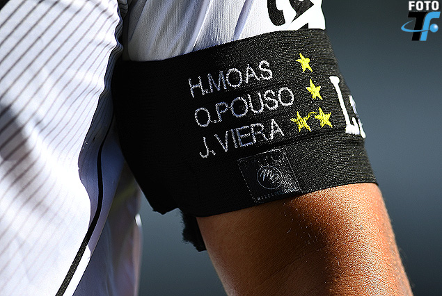 El brazalete de Leandro Sosa con los capitanes campeones: Heber Moas, Omar Pouso y Jadson Viera.