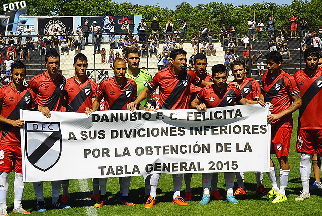 “Danubio FC, felicita a sus “diviciones” inferiores por la obtención de la tabla general 2015”, la pancarta con falta de ortografía que exhibieron los jugadores franjeados.