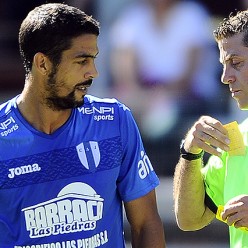Fernando Machado, en el momento que Fernando Falce le muestra tarjeta amarilla, la quinta.