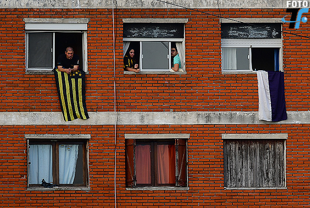 Hinchas… Partido aparte en el edificio de ladrillos que se encuentra detrás de una las cabeceras del Parque Capurro. Duelo de vecinos, en el segundo piso: un hincha de Peñarol con su bandera, otro dos parciales aurinegros en la ventana lindera y la bandera de Fénix colgada de la tercera ventana.