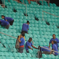 Los operarios en plena tarea en las tribunas del estadio Fonte Nova de Bahía.