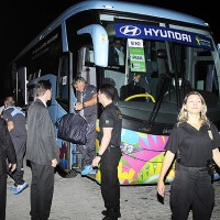 La nota gráfica muestra al ómnibus de la delegación ingresando al Hotel por la parte posterior del mismo. Una guardia de seguridad contuvo a la veintena de hinchas que lograron llegar hasta all{i.
