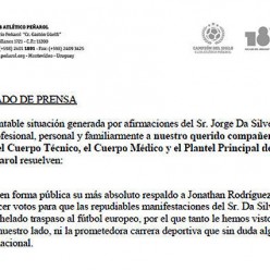 Ante la lamentable situación generada por afirmaciones del Sr. Jorge Da Silveira, que afectaron profesional, personal y familiarmente a nuestro querido compañero Jonathan Rodríguez, el Cuerpo Técnico, el Cuerpo Médico y el Plantel Principal del Club Atlético Peñarol resuelven: