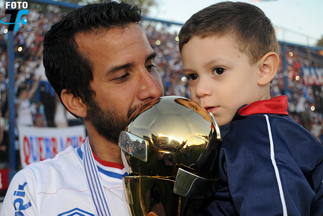 Mauricio Victorino con su hijo con una nueva copa de campeón.