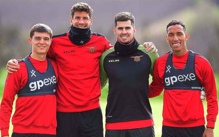 Rafael Haller, Felipe Avenatti, Randall Rodríguez y el venezolano Andrés Romero, las incorporaciones de Boston River, posan en el complejo La Sastrería.