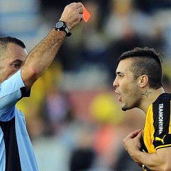Ahí está la única roja que le mostraron a Peñarol en el Clausura. Fue justamente Javier Bentancor, a Diogo.