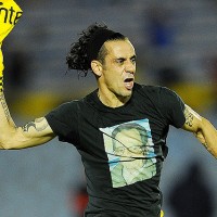 Sebastián Abreu corre lleno de alegría y con su dedo indice dedica el gol que abrió el camino del triunfo tricolor.