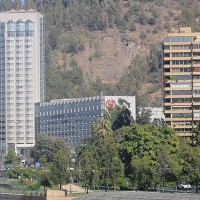 ¡El Hotel Sheraton San Cristóbal! Una hermosa construcción ya un poco antigua -la parte vieja del hotel-, hoy muestra pegado a ella un enorme edificio moderno conteniendo el alojamiento VIP que se ha puesto en funcionamiento. La delegación de Uruguay ocupa la parte vieja, la que está ligada a varios episodios lamentablemente negativos de la misma historia de la selección uruguaya en ocasión de disputar aquí, en Santiago, partidos trascendentes por las eliminatorias para la Copa del Mundo. Desde abajo, camino al centro, los dos bloques de hormigón aparecen recostados sobre la inmensidad de las montañas de la pre Cordillera de los Andes.