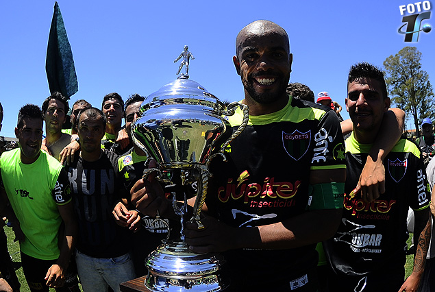 El festejo del verdinegro en la cancha del Estadio Campeones Olímpicos con la Copa.