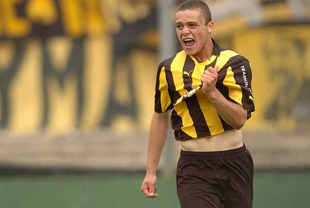 Jonathan Rodríguez, delantero de Peñarol, celebrando un gol tercera división.