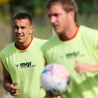 Junior Arias y Federico Laens, la dupla ofensiva en pleno trabajo en cancha del estadio Della Valle.