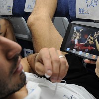 En pleno vuelo Suárez firma un autógrafo en una bandera uruguaya a pedido de un viajero.