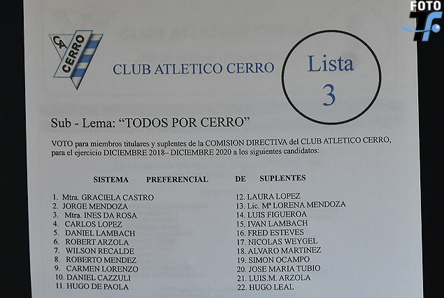 Los socios de Cerro votaron el domingo en la sede y eligieron a Graciela Castro como Presidenta de la institución. La lista 3 (seis cargos en la directiva) ganó con 131 votos. La lista 2 (Marcos Lombardi, tres lugares) culminó en el segundo lugar con 99 votos y la lista 1 (Alfredo Jaureguiverry, dos) con 92. Hubo cuatro en blanco en el total de los 326 sufragios.