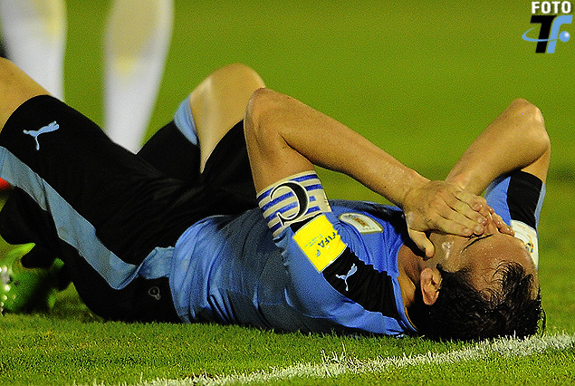 El capitán Diego Godín es la imagen de la derrota. En el piso y tapándose el rostro con sus manos.