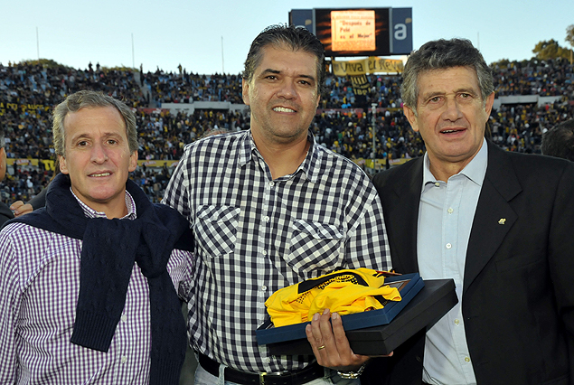 Juan Pedro Damiani, Pedro Rocha hijo y Fernando Morena en el emotivo homenaje a una de las glorias de Peñarol.