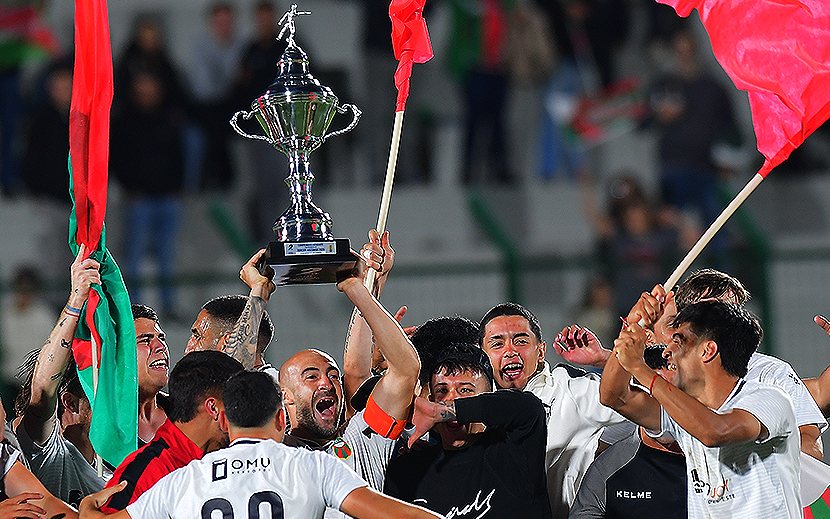 El capitán Facundo Tealde, levanta el trofeo ante la algarabía de sus compañeros tras lograr el anhelado ascenso a Primera división. Deportivo Maldonado regresó a la máxima categoría.