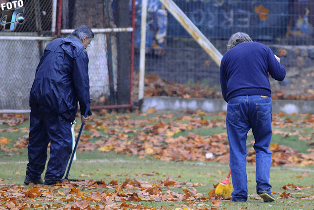 DOMINGO LLUVIOSO Y OTOÑAL: En el colorido Parque Federico Omar Saroldi tuvieron doble trabajo los cancheros para barrer el sinfín de hojas que cayeron en la cancha en el domingo otoñal en pleno Prado.